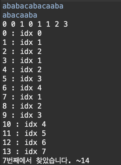 이렇게 끝까지 탐색하면 idx = 7 ( pattern문자열 길이-1)에 도달한다. 이는 매칭이 되었다는 뜻이므로 탐색을 완료해준다.