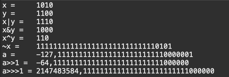 System.out.println("~x = \t" + Integer.toBinaryString(~x)); // int는 4byte = 32bit이기때문에 앞에 28개의 1이 출력됨