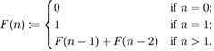 수학에서, 피보나치 수는 위의 점화식과 같이 귀납적으로 정의되는 수열이다. 위의 식에서도 알 수 있듯이, 피보나치 수 F(n)은 0 이상의 n에 대해서만 정의된다.
