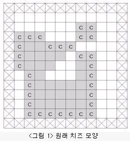 아래 <그림 1>과 같이 정사각형 칸들로 이루어진 사각형 모양의 판이 있고, 그 위에 얇은 치즈(회색으로 표시된 부분)가 놓여 있다. 판의 가장자리(<그림 1>에서 네모 칸에 X친 부분)에는 치즈가 놓
