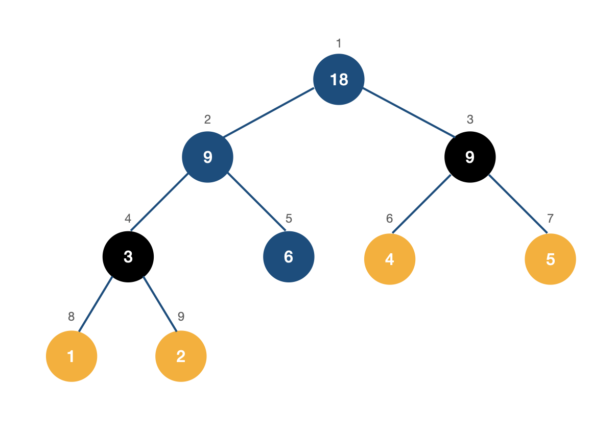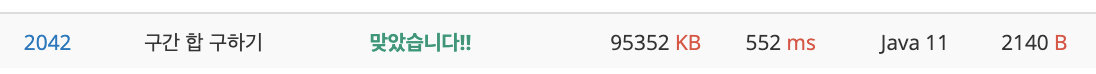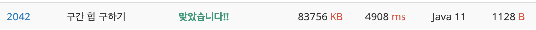 → 주의할 점은 구간 합 트리는 항상 구간의 합을 가지고 있는 형태이므로 노드의 인덱스 값과 헷갈리면 안된다.