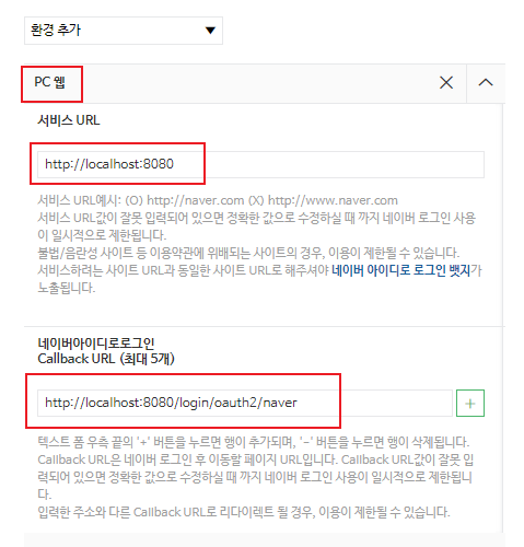 3) 환경 추가 (PC 웹) > 서비스 URL 입력 (http://localhost:8080) > 네이버 아이디로 로그인 입력 (http://localhost:8080/login/oauth2/naver) > 등록하기