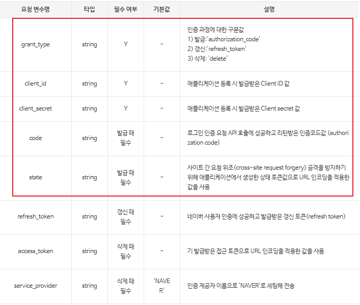 토큰 발급에 필요한 정보는 다음과 같다. 발급 받을 때 grant_type, client_id, client_secret, code, state의 데이터는 필수로 제공해줘야 한다.