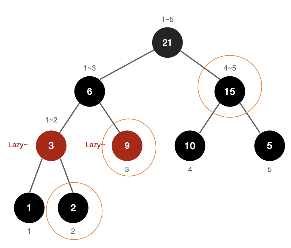 구간합을 구하기 위해서 pSum로직을 통해 해당 주황 동그라미를 친 노드(3, 5, 9)들을 방문해야 한다. 그러기 위해서는 현재 lazy가 걸려있는 4, 5번 노드를 거쳐야하므로 업데이트를 해줘야한다. 만약 [4,5]구간에서의 구간합을 구하는 거였다면 해당 lazy노드들은 이번 단계에서도 업데이트가 되지않고 lazy상태로 머물러있게 되었을 것이다.