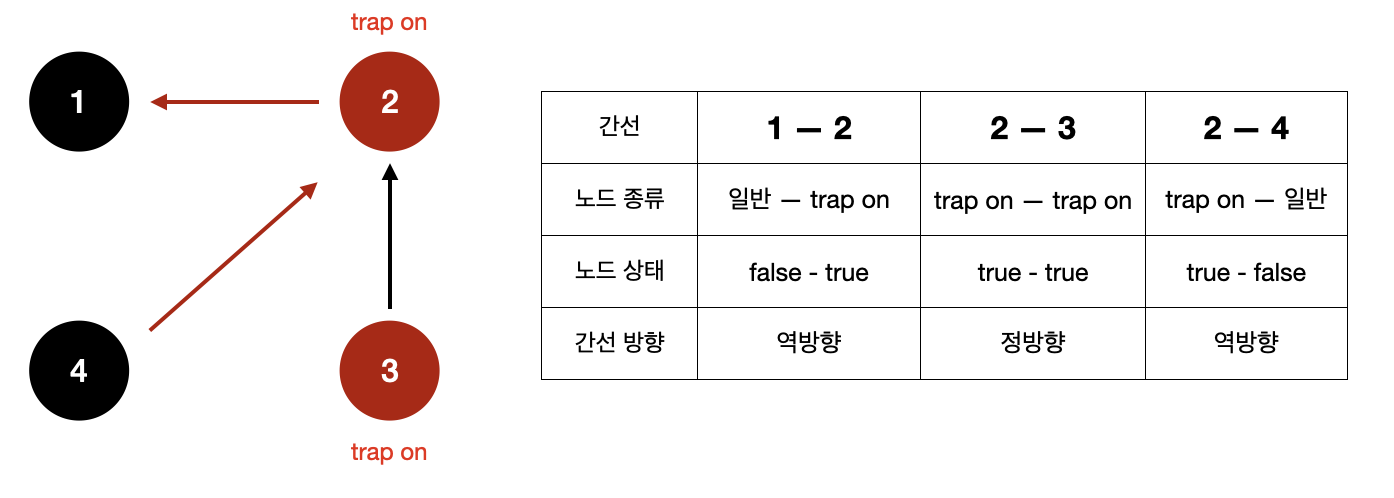 → (1-2), (2-4) 간선은 trap이 활성화된 2번 노드와 연결되어 있어 역방향을 가지고 있다.
