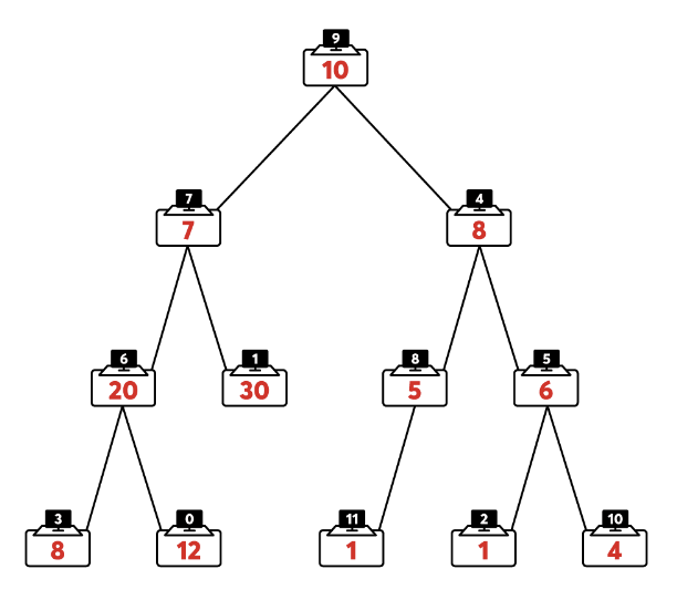 카카오 인턴을 선발하는 코딩 테스트 시험장이 하나의 이진 트리1 형태로 연결되어 있습니다. 아래 그림은 12개의 시험장이 연결된 예시입니다.