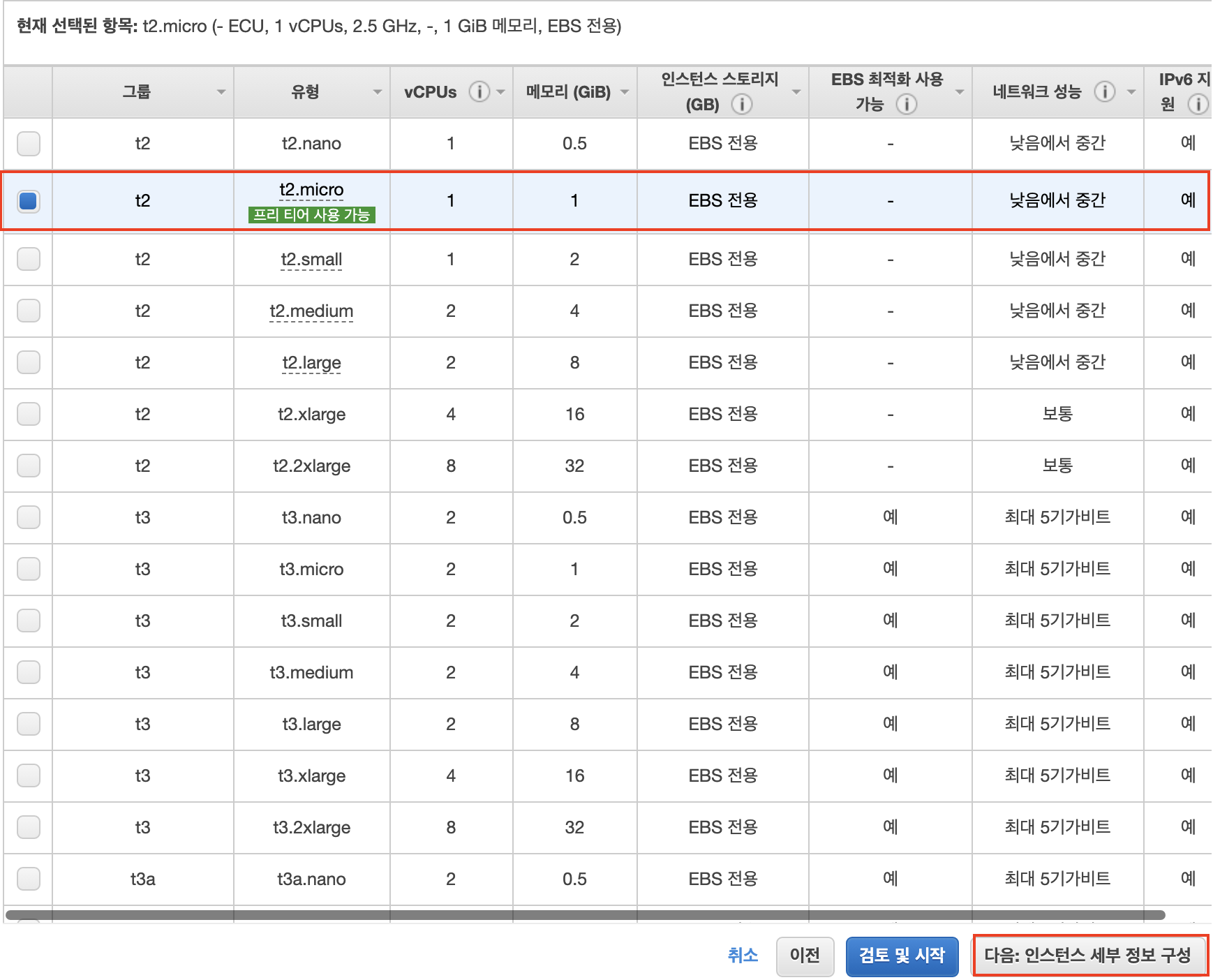 4) 인스턴스 유형 t2.micro 선택 > 인스턴스 세부 정보 구성은 패스