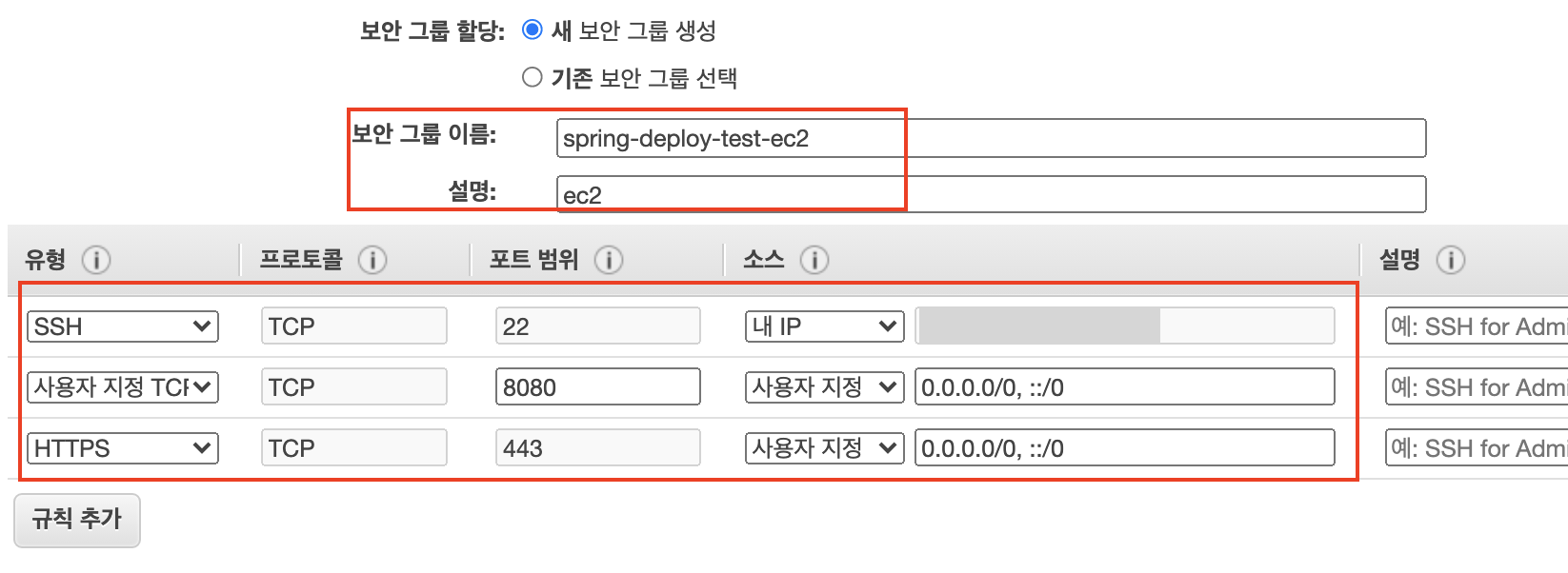 7) 보안 그룹 추가 > [내 IP 설정, 기본 8080 포트 설정] > 검토 및 시작 클릭