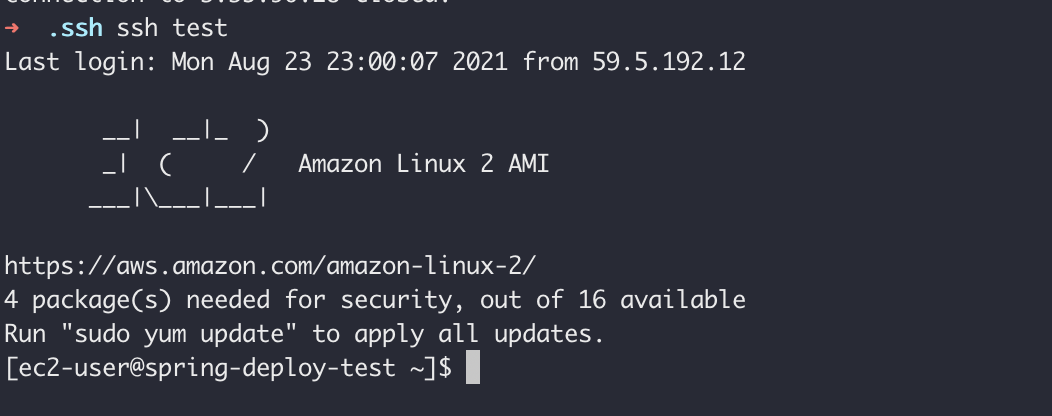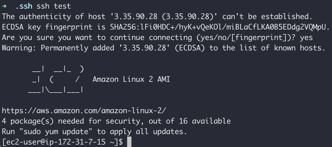 이제 ssh {Host 이름}으로 EC2에 접속해보자. yes를 입력하면 다음과 같이 EC2 접속에 성공한다.