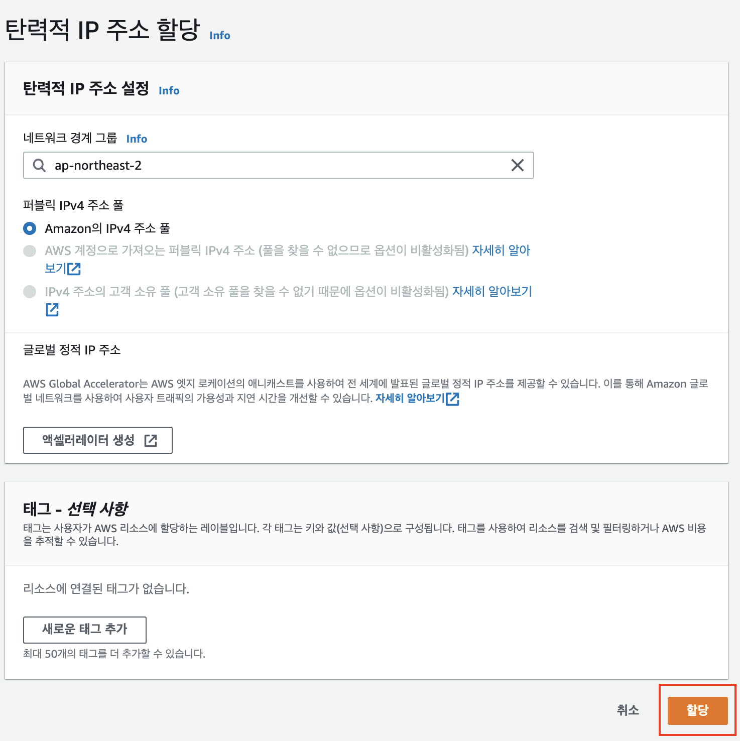 10-1) 메뉴 : 탄력적 IP 클릭 > 탄력적 IP 주소 할당 버튼 클릭 > 할당 버튼 클릭