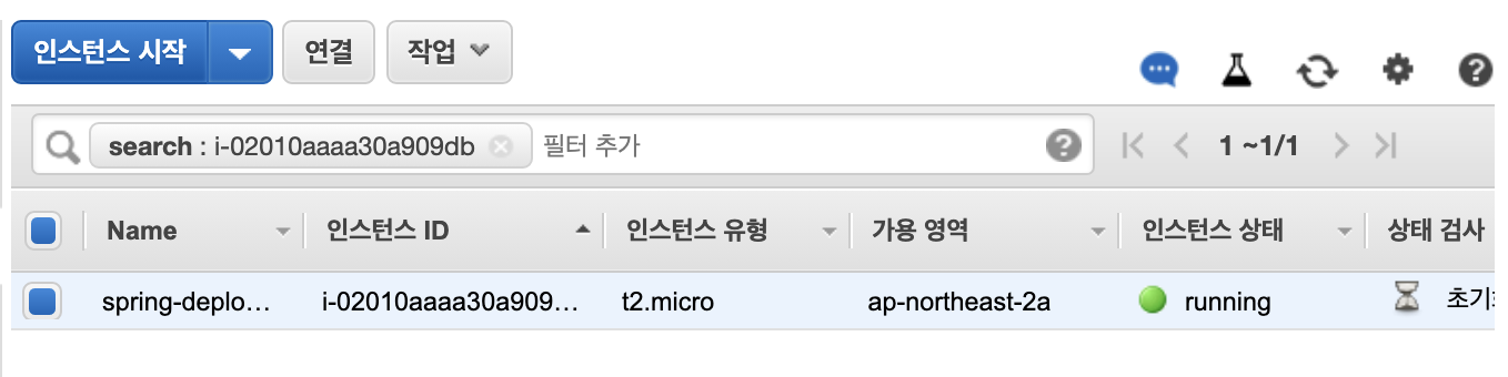 10-3) 생성한 EC2 인스턴스(spring-deploy-test) 선택 > 연결
