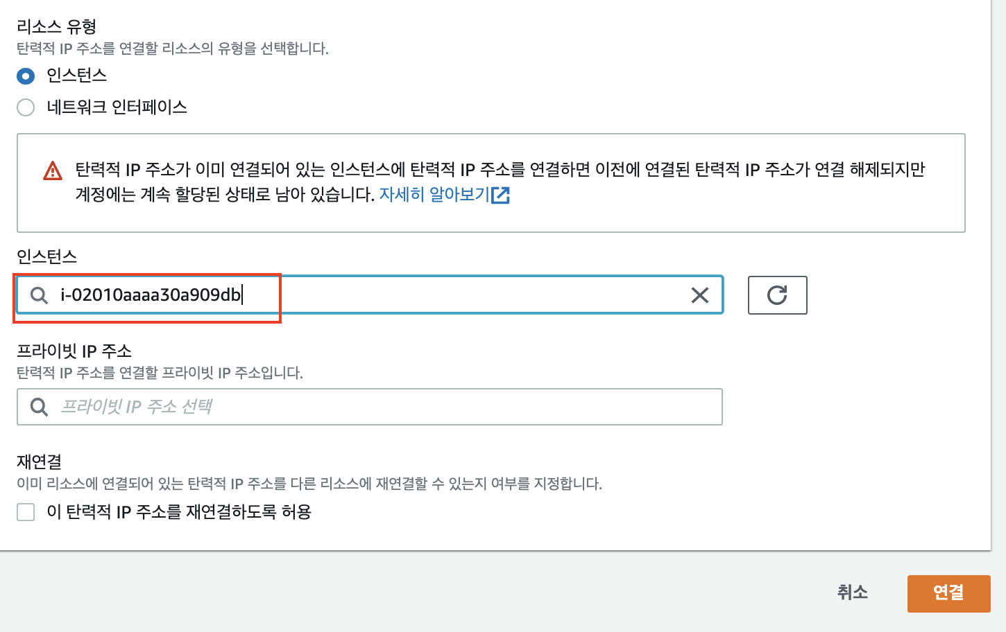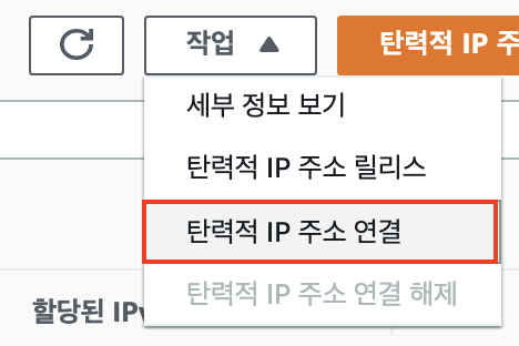10-2) 생성된 탄력적 IP 클릭 > 작업 > 탄력적 IP 주소 연결 클릭