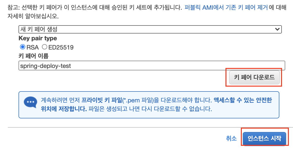 인스턴스로 접근하기 위해서는 pem키가 필요하다. 그래서 마지막 단계는 할당할 pem키를 선택해준다. 일종의 마스터 키이기 때문에 절대 유출하면 안된다. 잘 관리할 수 있는 디렉토리로 저장한다. 기존에 생성된 pem키가 있다면 선택하고 없으면 생성한다.
