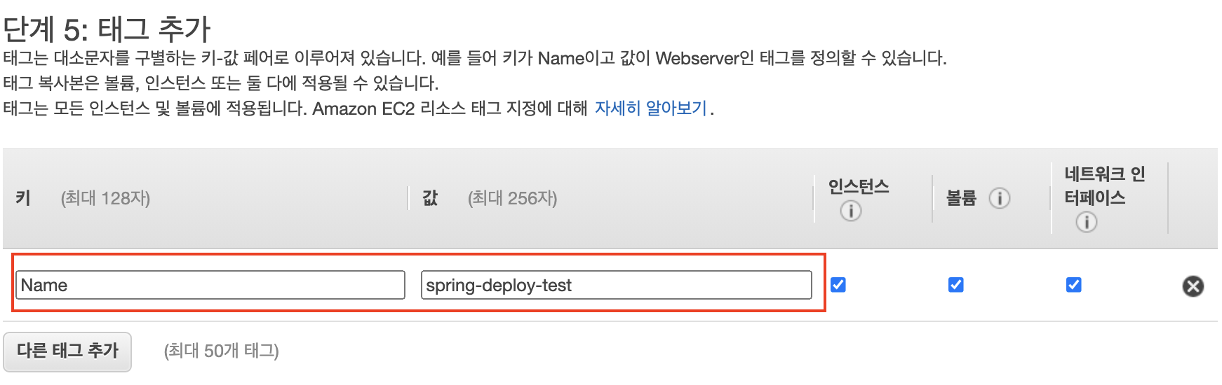 웹 콘솔에서 표기될 태그인 Name 태그를 등록한다. 태그는 해당 인스턴스를 표현하는 여러 이름으로 사용될 수 있다.