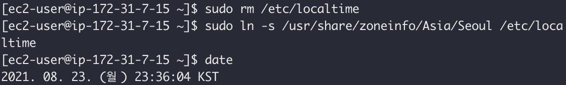 - sudo ln -s /usr/share/zoneinfo/Asia/Seoul /etc/localtime