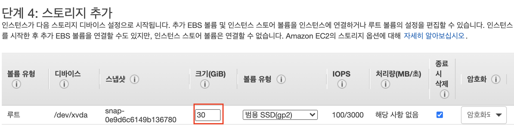 5) 스토리지 구성 > 크기(GiB) 30으로 설정