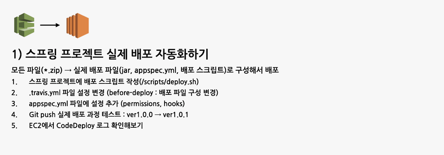 앞의 과정으로 Travis CI, S3, CodeDeploy 연동까지 구현되었다. 연동하는 과정만 빠르게 체크하기 위해서 EC2에 보낸 파일은 스프링 프로젝트 전체를 묶어서 보냈다. 이제 그 파일을 실제 배포에 필요한 파일들로만 구성해서 보내주면 된다.