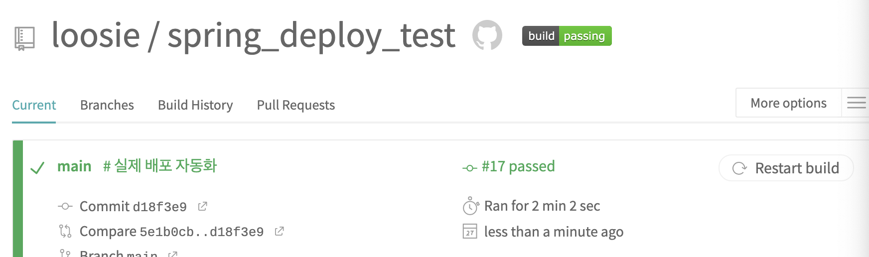 모든 설정이 완료되었으니 깃헙으로 commit과 push를 진행한다. Travis CI에서 다음과 같이 성공 메시지를 확인한다.