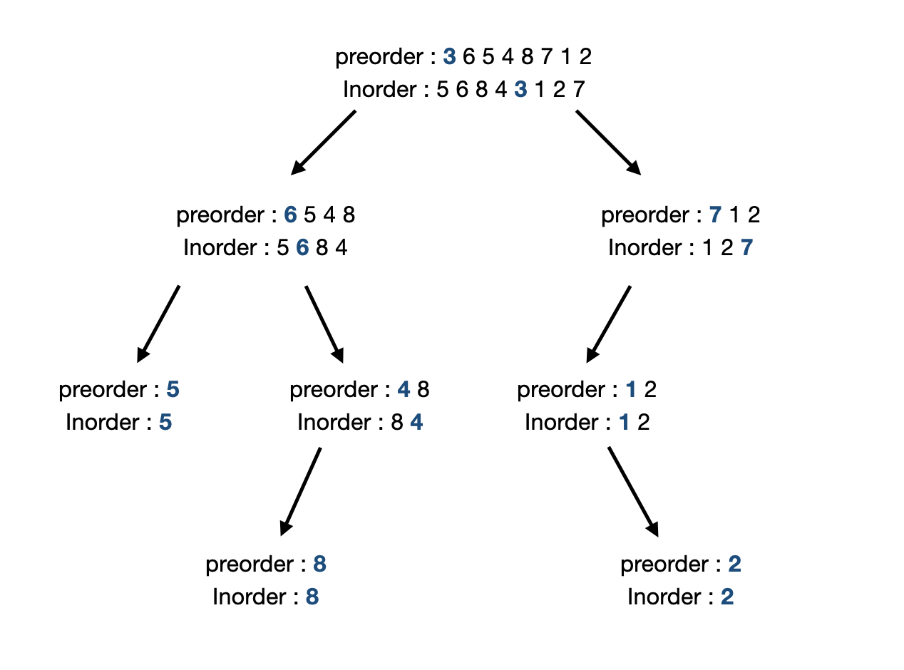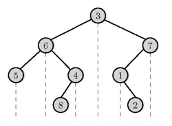 예를 들어, 위의 그림을 전위 순회하면 3,6,5,4,8,7,1,2, 중위 순회하면 5,6,8,4,3,1,2,7이 된다. 이를 이용해 후위 순회하면 5,8,4,6,2,1,7,3이 된다.