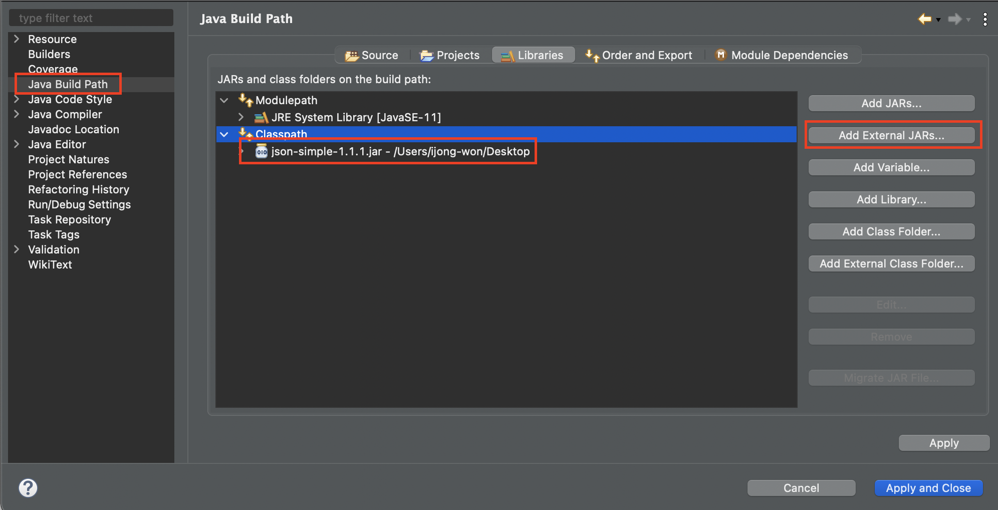 Java Project 우클릭 > Properties > Java Build Path > Libraries > Classpath > Add External JARs... 버튼 > 1번에서 다운받은 파일 (json-simple-1.1.1.jar) 선택 후 적용