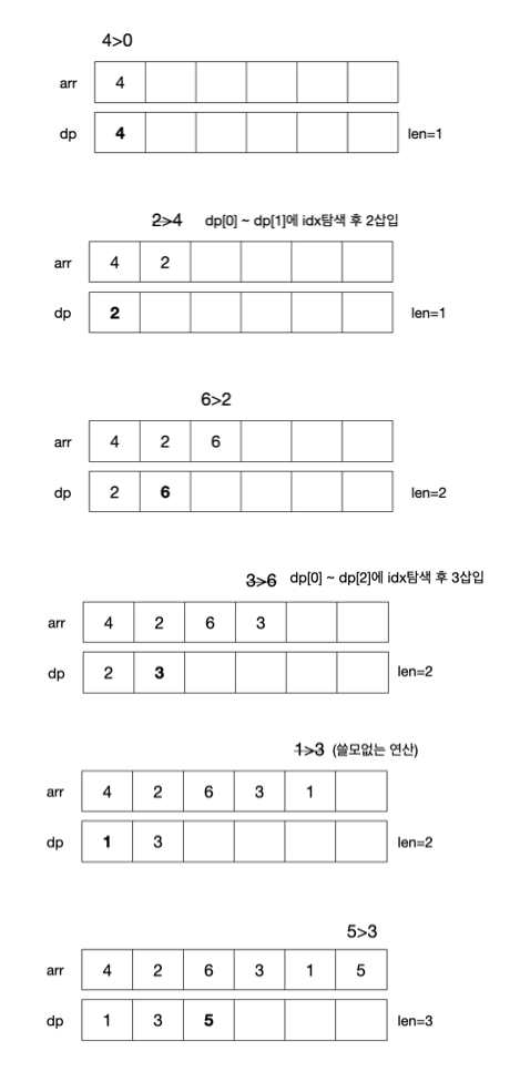- 이진탐색을 통해 dp[i-1] <= arr[i] <= dp[i]인 곳을 찾아(idx) 값을 갱신해준다.