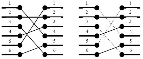 예를 들어 왼쪽 그림이 n개의 포트와 다른 n개의 포트를 어떻게 연결해야 하는지를 나타낸다. 하지만 이와 같이 연결을 할 경우에는 연결선이 서로 꼬이기 때문에 이와 같이 연결할 수 없다. n개의 포트가 다른 n개의 포트와 어떻게 연결되어야 하는지가 주어졌을 때, 연결선이 서로 꼬이지(겹치지, 교차하지) 않도록 하면서 최대 몇 개까지 연결할 수 있는지를 알아내는 프로그램을 작성하시오