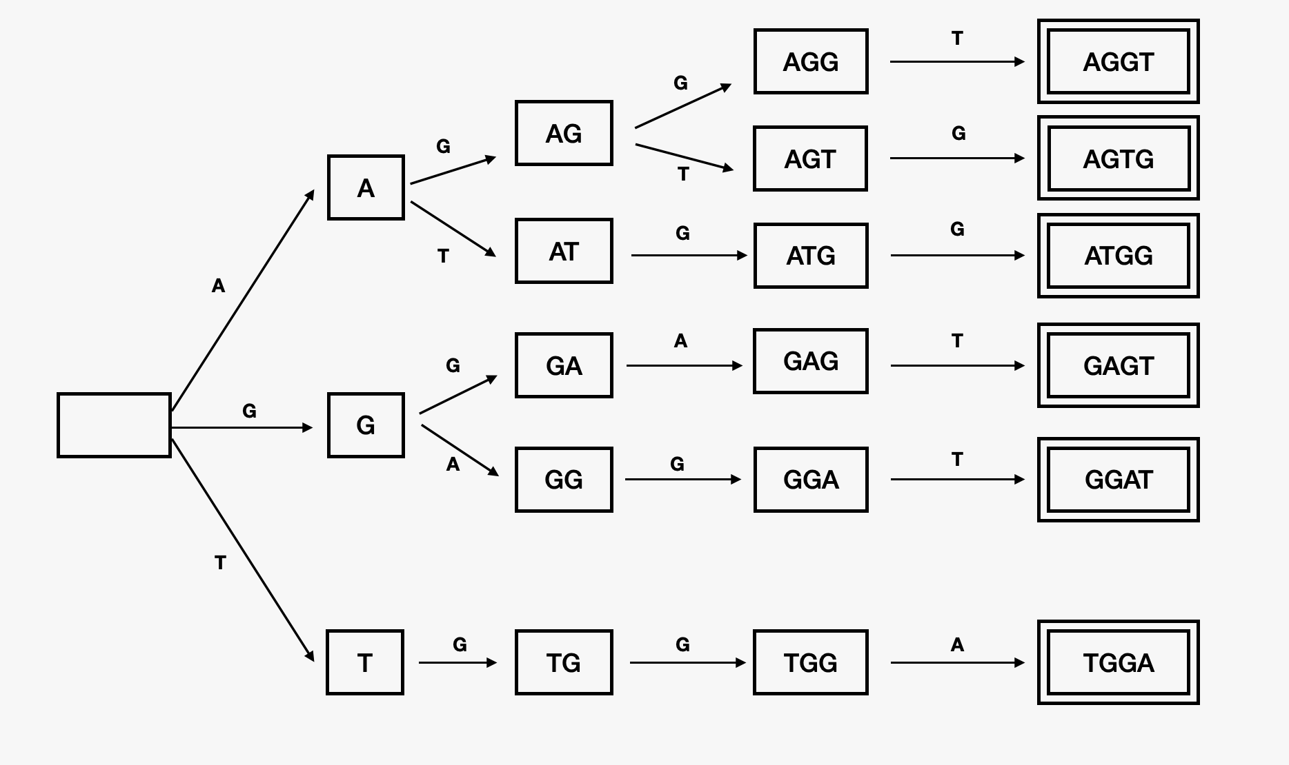 예를 들어 마커가 AGGT라면 아래와 같은 여섯 가지 경우가 가능하다.