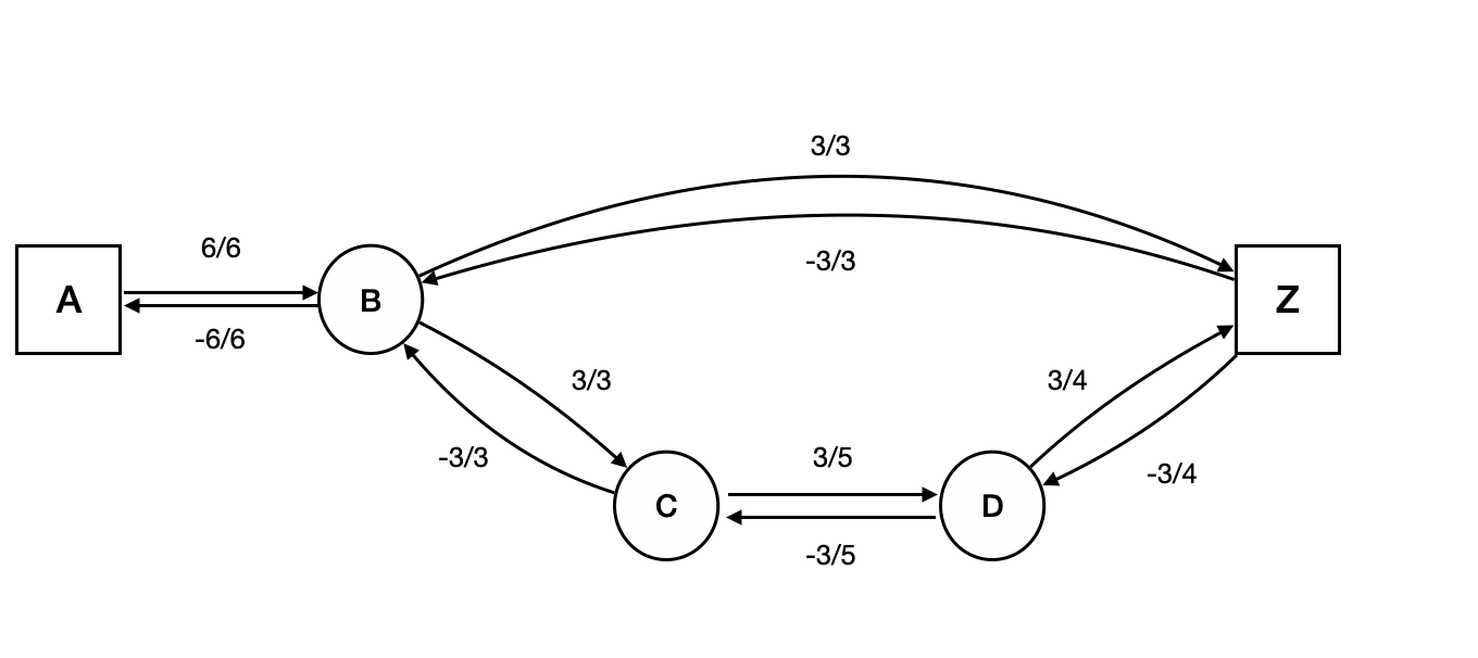 - 구한 유량의 양을 그대로 src(A)에서 sink(Z)로 내보낸다. 단, 여기서 대칭성을 고려하여 반대 유량도 고려해줘야 한다.