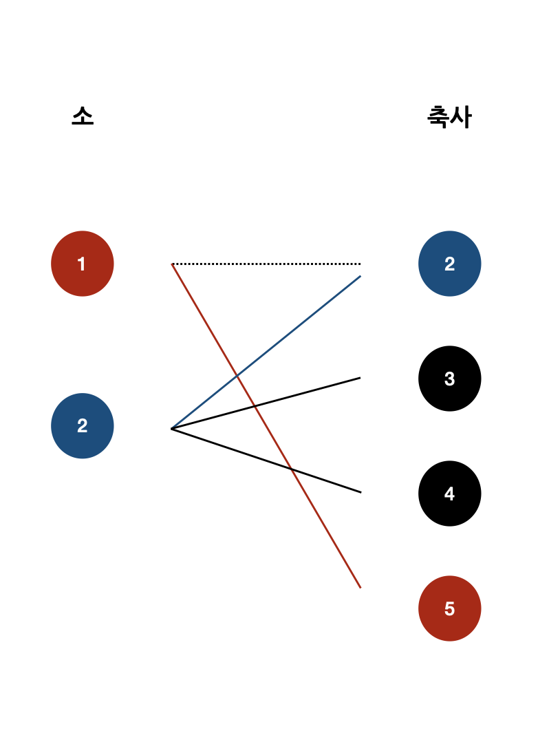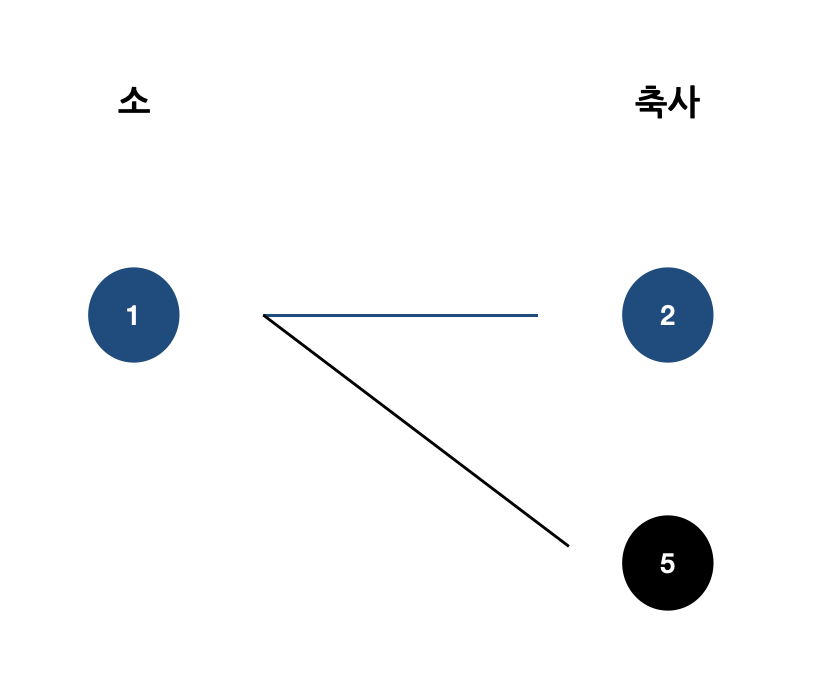 - 1번 소는 5, 2번 소는 2에 매칭한다.