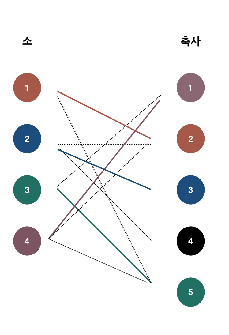- 따라서 (1번 소 - 2), (2번 소 - 3), (3번 소 - 5), (4번 소 - 1)로 매칭이 된다.