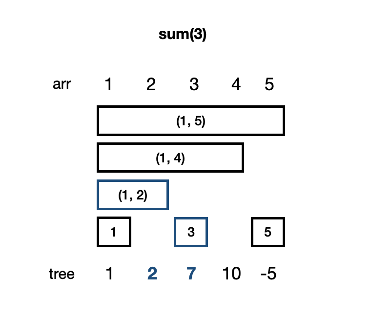 예를 들어 arr[3]을 구하기 위해 더해야 하는 숫자는 3에서 끝나는 구간의 합 3번 노드, 2에서 끝나는 구간의 합 b[2]이다.