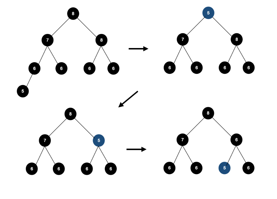 - 이 작업을 트리의 바닥에 도달하거나, 두 자손이 모두 자기 자신 이하의 원소를 갖고 있을 때까지 반복한다.