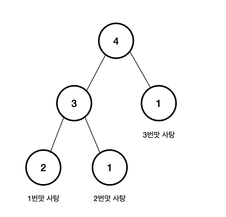 세그먼트의 인덱스를 사탕의 맛이라하고, 해당 인덱스에 들어있는 값을 갯수를 가진 합 세그먼트 트리로 풀이를 하면 된다. 맛이 1인 사탕 2개, 2인 사탕 1개, 3인 사탕 1개가 있다고 하면 세그먼트 트리를 다음과 같이 생성된다.