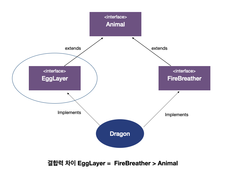 Dragon이 두 인터페이스를 상속했고 EggLayer에 정의된 identityMySelf()를 사용했다. 결합의 관점에서 살펴보면 당연히 EggLayer의 메서드를 호출하는 게 맞다. 그리고 실제로도 그렇게 동작한다. Animal의 identityMySelf()는 이미 EggLayer 인터페이스에서 오버라이딩되었기 때문에 호출되지 않고 오버라이딩된 EggLayer 메서드가 호출된다