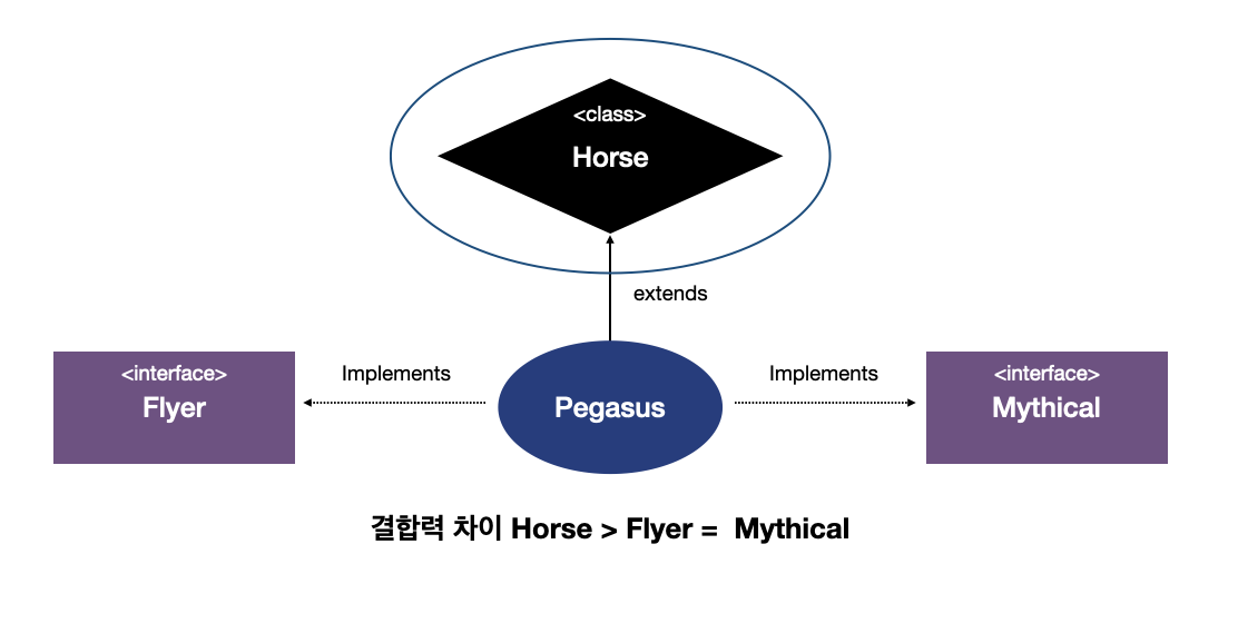 만약 인터페이스에서 default메서드가 아닌 abstract 메서드로 정의되어있다면 Pegasus에서 직접 구현하지 않는 이상 Horse 클래스의 메서드를 따른다. 당연히 Pegasus에서 abstract 메서드를 구현한다면 가장 결합력이 높은 자신 클래스에 정의된 메서드를 따르게 된다.