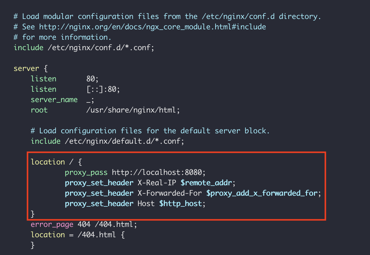 Nginx를 설치하면 설정 파일이 자동으로 생성된다. 해당 설정 파일을 열어서 스프링 프로젝트에 접속할 수 있도록 프록시 설정을 변경해보자.