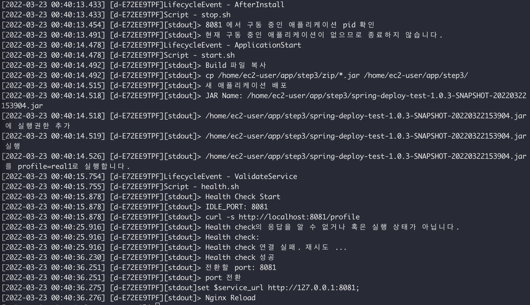 EC2에서 다음과 같은 명령어로 CodeDeploy 로그로 잘 진행되는지 확인할 수 있다.