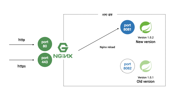 - 스프링 1의 배포가 끝나고 나면 Nginx를 Reload하여 스프링 1로 연결을 변경한다.