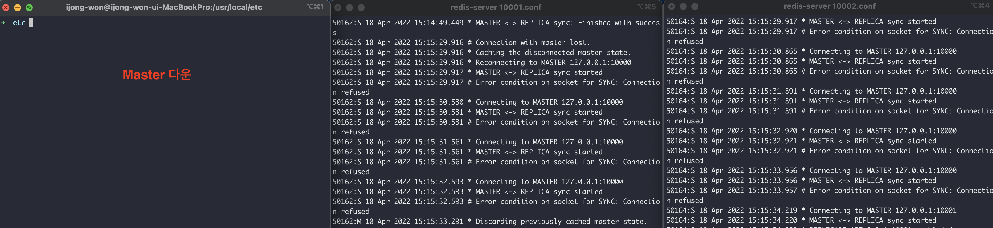 그럼 이제 Master를 직접 다운시켜보자. 그러면 Slave 노드들은 잠시동안 Master와 싱크 연결이 안되기 때문에 에러 로그가 발생한다.