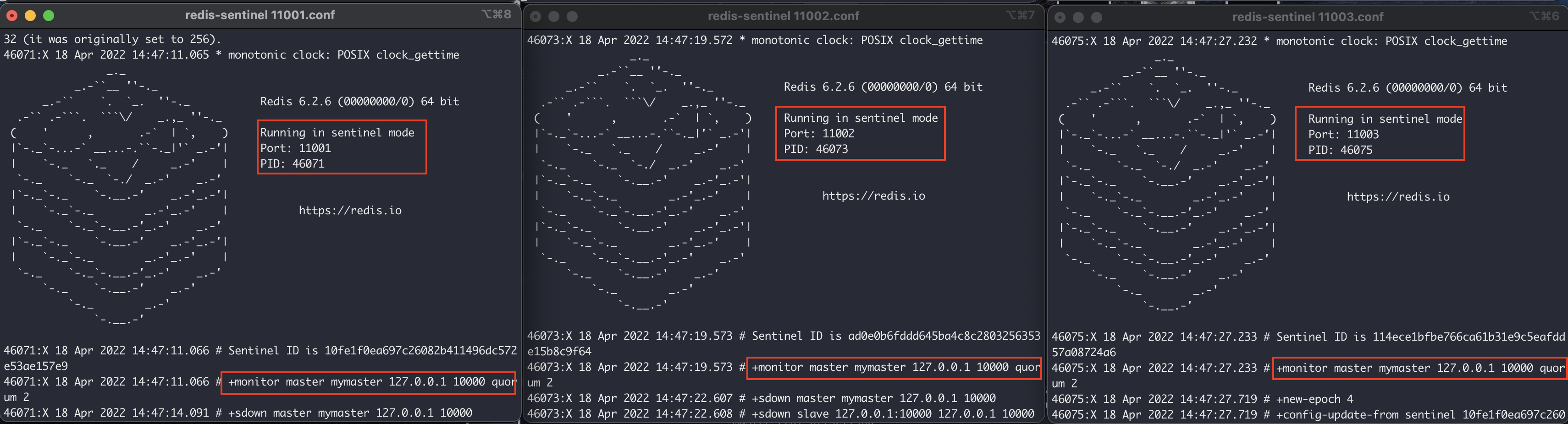 Sentinel 노드 3개를 구동시킨다. 그러면 다음과 같이 실행된 화면을 확인할 수 있다.