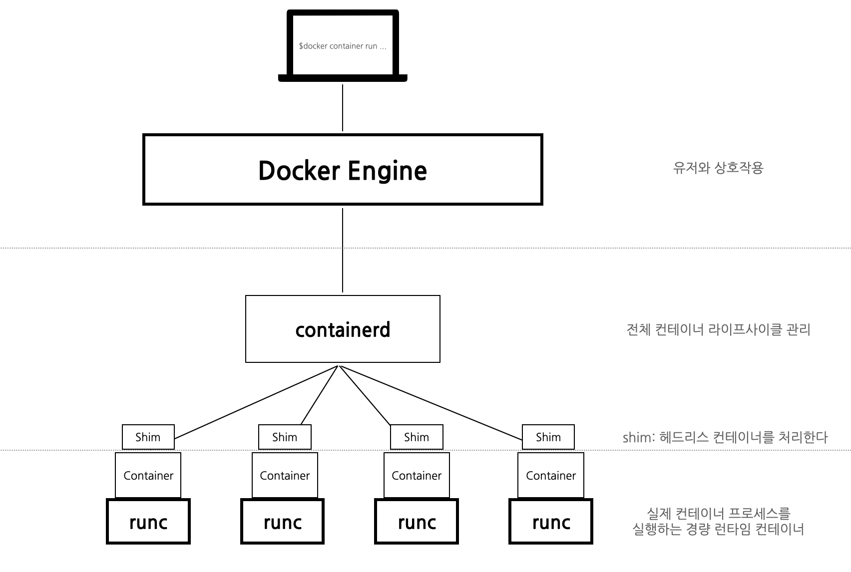 - Container-shim: 헤드리스 컨테이너를 처리한다. 즉, runc가 컨테이너를 초기화하면 일부 중개자 역할을 하는 Container-shim에 컨테이너를 넘겨주게 된다.