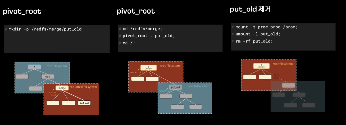 - pivot_root: 컨테이너가 시작될 때, pivot_root는 새로운 루트 파일 시스템으로 전환하는 데 사용된다. 이 기능은 컨테이너의 파일 시스템을 호스트 OS로부터 격리시켜 해킹 보안에 있어서 중요하다. 기본적으로, 컨테이너 내부에서는 해당 컨테이너의 파일 시스템만 볼 수 있도록 한다.