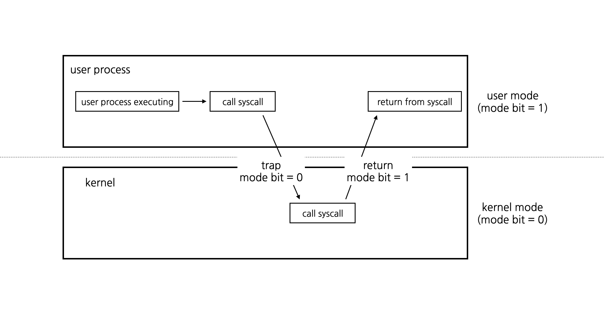 user 모드에서 실행되는 프로그램은 특정 시스템 자원에 접근하거나 특정 명령을 실행할 권한이 제한되지만, kernel 모드에서는 그러한 제한 없이 시스템 자원에 접근하거나 명령을 실행할 수 있다. 컴퓨터가 켜진 뒤에 한 사용자 애플리케이션을 실행시키는 동안 대략적으로 다음과 같이 명령어가 실행된다.