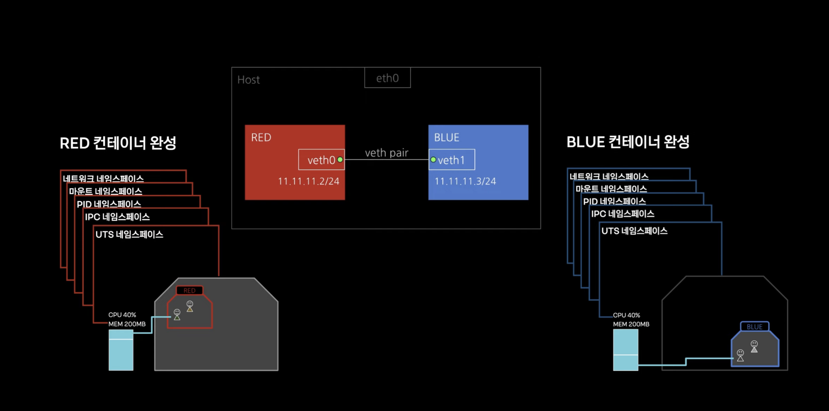1~4 내용을 토대로 컨테이너 2개를 직접 생성하여 통신까지 테스트를 해볼 수 있다. 통신은 네트워크 네임스페이스를 통해 veth(가상 이더넷)로 네트워크 가상화를 이루어 각 컨테이너에게 할당해주면 된다.