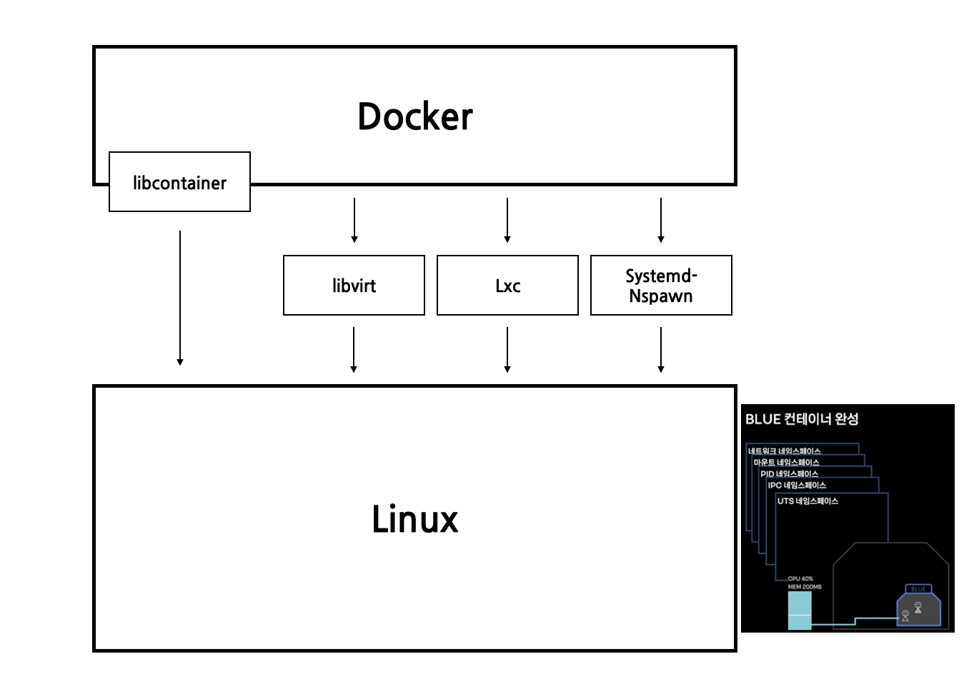- libcontainer: Docker는 LXC의 몇 가지 제약 사항과 제한 사항을 극복하기 위해 자체 컨테이너 실행 라이브러리인 libcontainer를 개발했다. libcontainer는 Docker 0.9 버전에서 도입되었으며, 이후 Docker의 기본 컨테이너 런타임이 되었다.