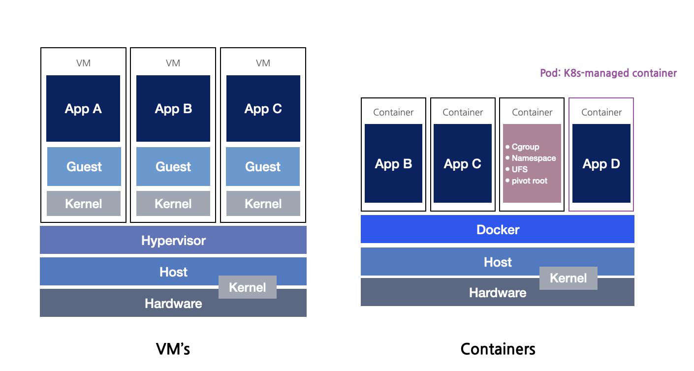컨테이너는 각각의 애플리케이션에 대해 가상의 실행 환경을 제공하며, 실제로는 동일한 운영체제 커널을 공유한다. 이러한 구조는 컨테이너가 가볍고 빠르게 실행될 수 있게 해주며 리소스를 효율적으로 격리한다. 그래서 VM보다 더 경량화된 가상화 기술이라고 불린다. 컨테이너 기술의 등장으로 애플리케이션들은 독립적인 서비스로 분할되어 더욱 유연하게 배포, 확장 및 관리될 수 있게 되었고 마이크로서비스 아키텍처에 적합하게 발전하였다.