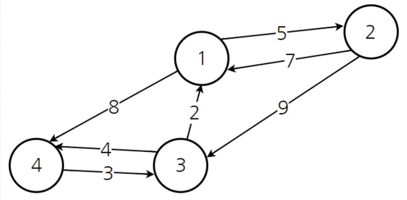 아래와 같은 그래프가 존재할 때 플로이드 와샬 알고리즘을 통해 모든 정점들의 최단 경로를 구해보자.